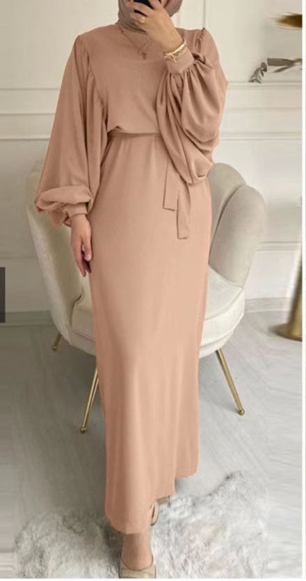Női ruha divat lámpás ujjú öv kerek nyakú köntös