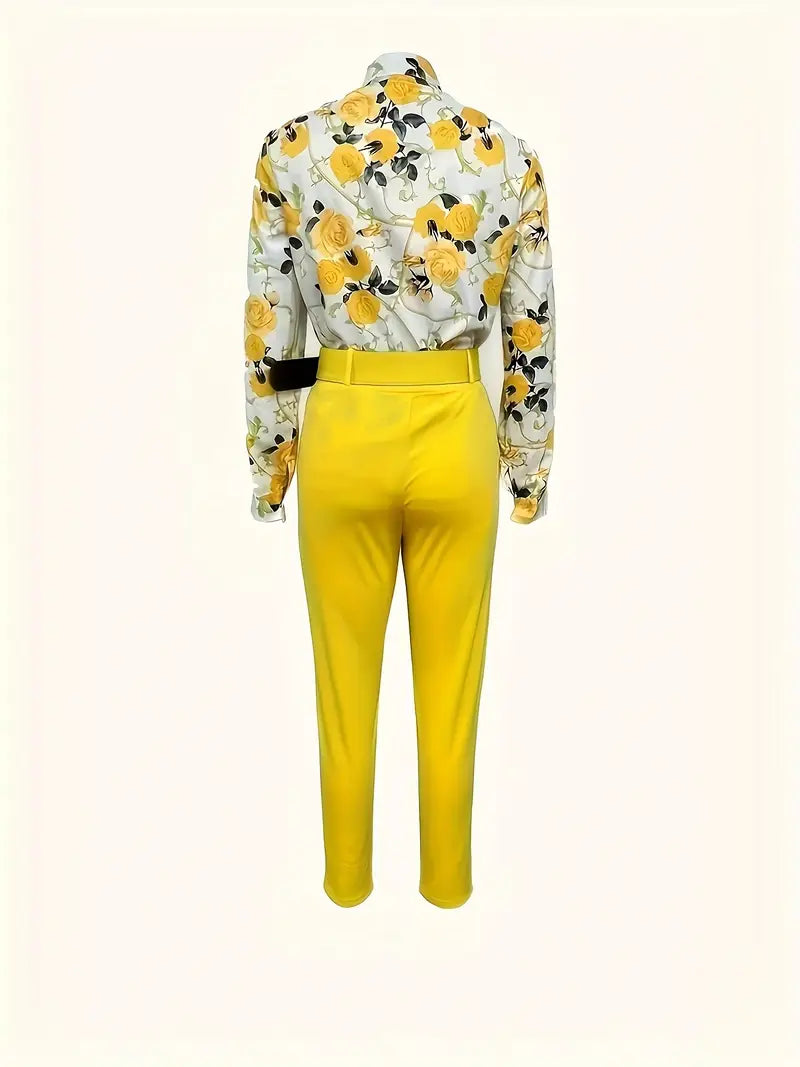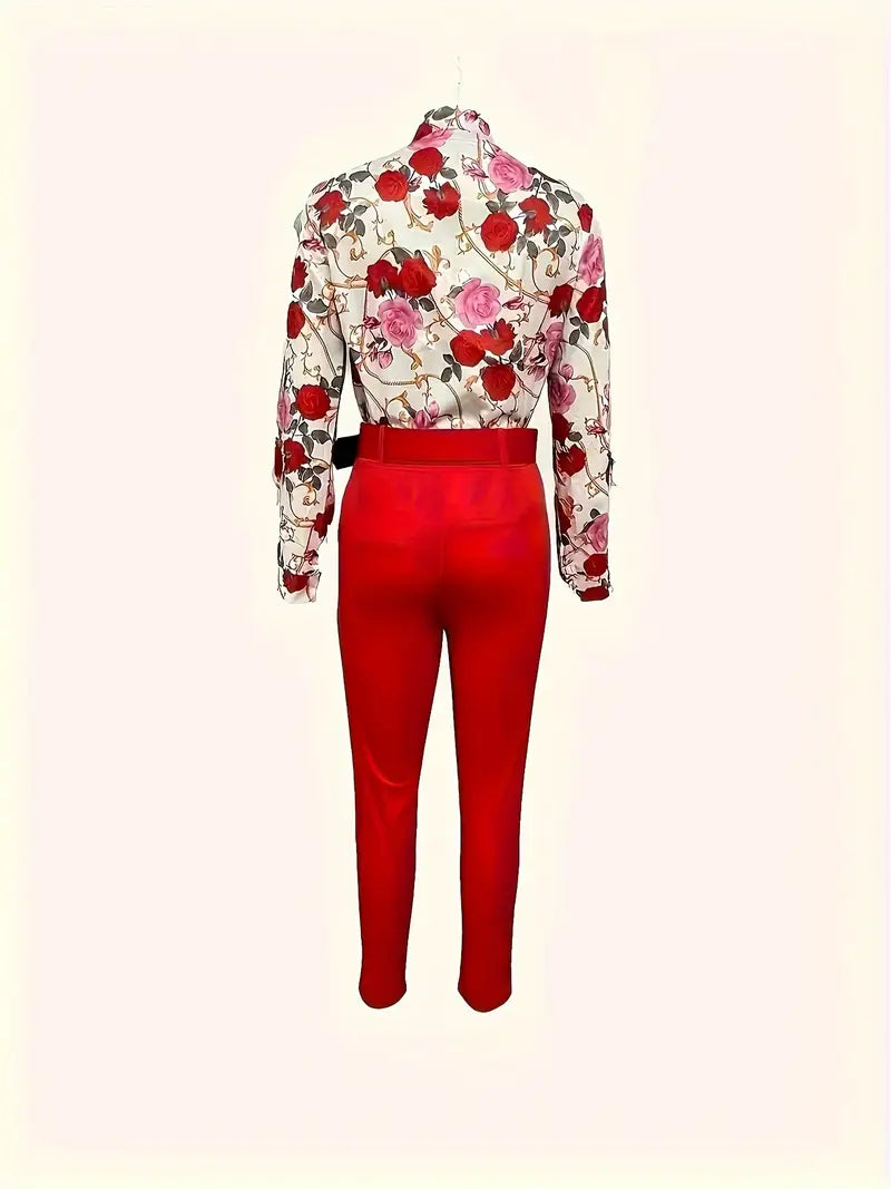 Elegáns kétrészes szett – Virágos blúz, öves nadrág, V-nyakkivágás.
