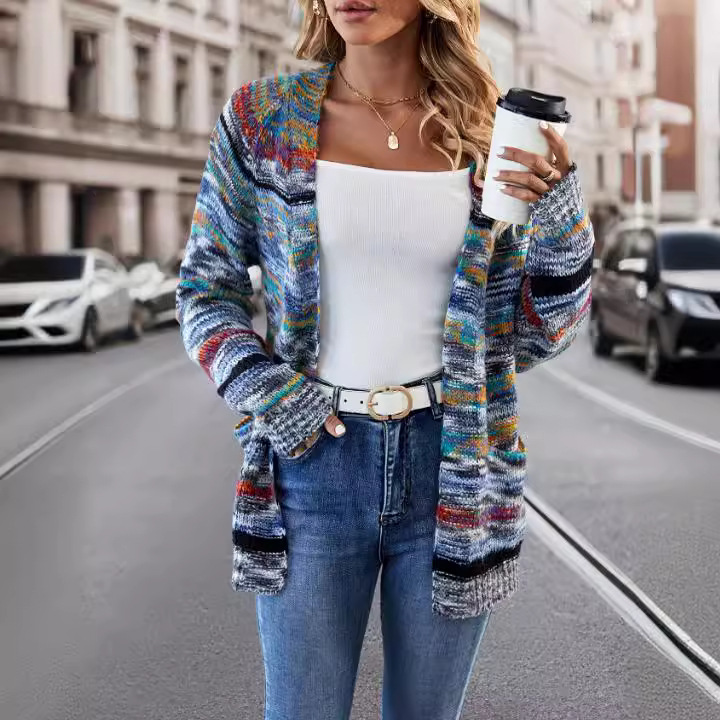Hangulatos kötött kardigán szivárványcsíkokkal
