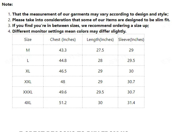 Méret Mellkas (hüvelyk) Hosszúság (hüvelyk) Ujj (hüvelyk) M 43,3 27,5 29 eu 44,8 28 29,5 XL 46,5 29 30 XXL 48 29 30,7 XXXL 49,6 29,5 30,7 4XL 51.2 30 31.4