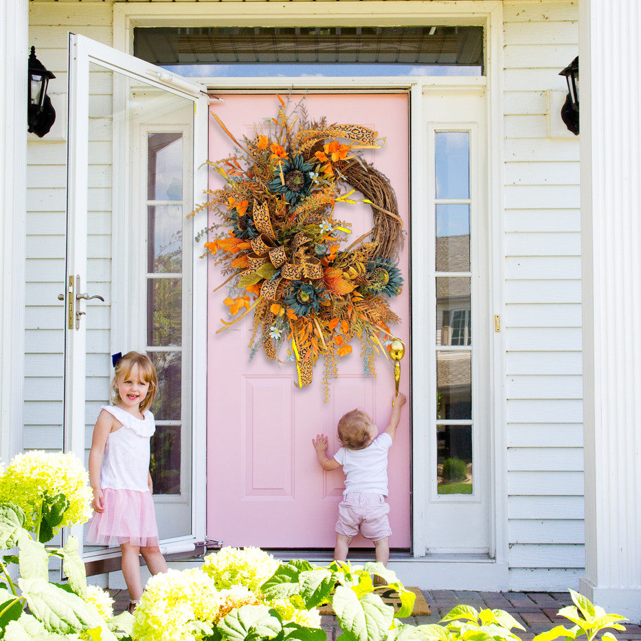 Fókusz: Kézzel készített👋 📐Méret: Hozzávetőleges méretek: 28”H x 24”Sz x 4”M (végtől a végéig mérve). 18”-os szőlőkoszorúra tervezték.) 🍂Tökéletes ajándék : Ez a gyönyörű bejárati ajtós napraforgókoszorú tökéletes barátok vagy családtagok számára! Jellemzők: 🍂 A szép napraforgókkal díszített koszorú és a kalikó virágmintás masni alkalmi varázsa tökéletes az őszi dekorációhoz. 🍂Az egyedi levelek és szőlők kombinációja még több francia vidéki varázst ad hozzá. Az édes zöld napraforgó