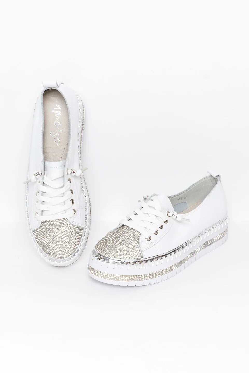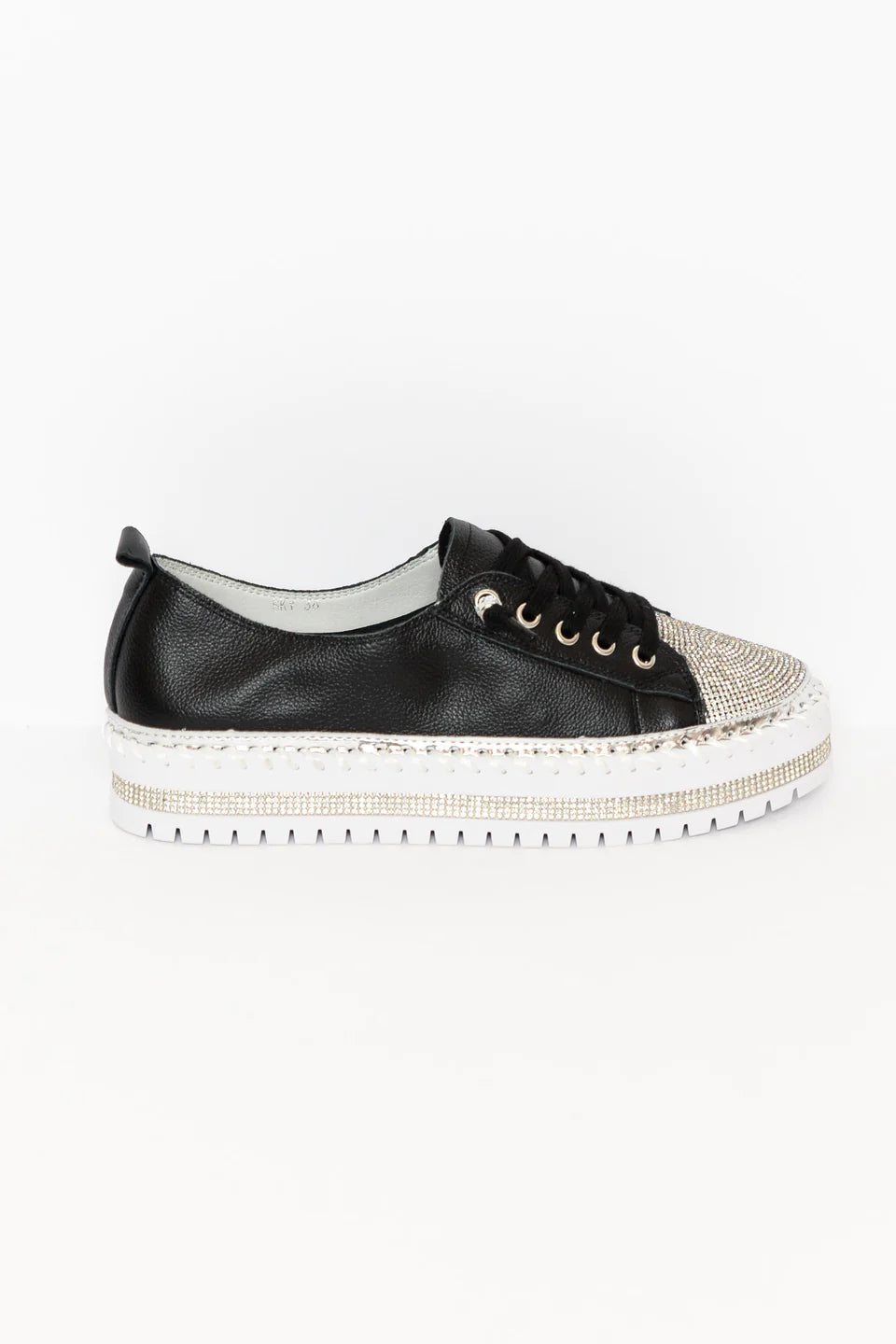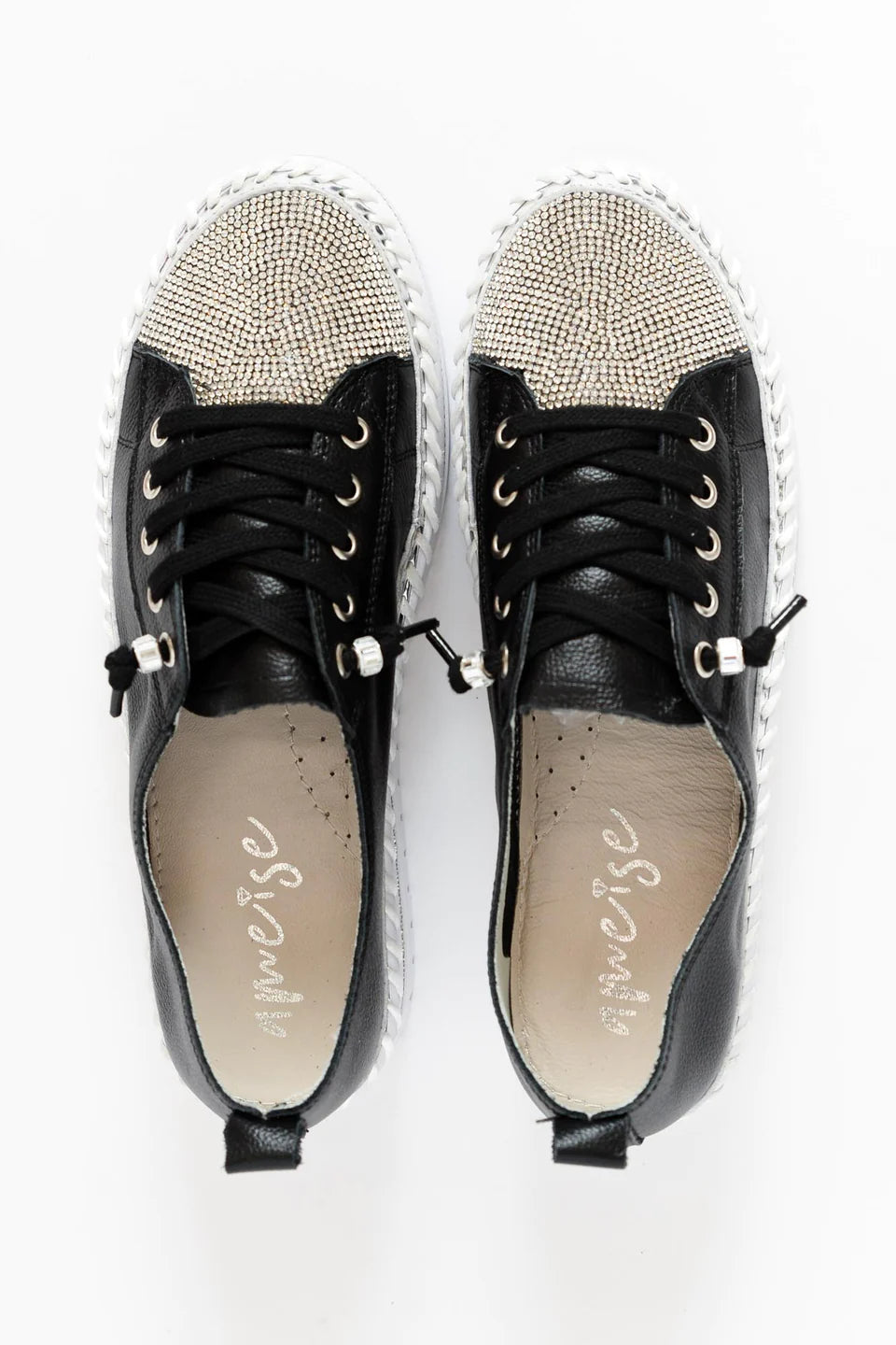 Strassz csíkok, fémes ezüst csíkok és vaskos látható varrások díszítik a talpat az egyedülállóan stílusos érintés érdekében