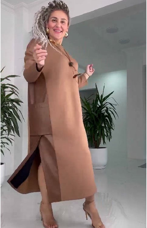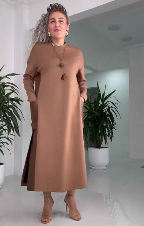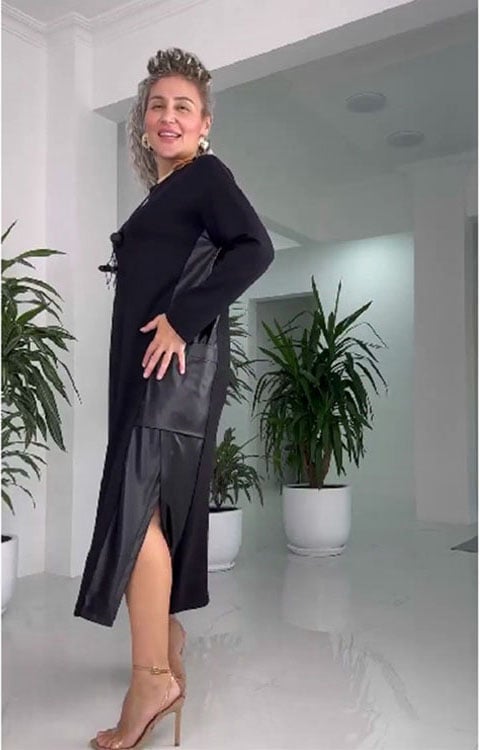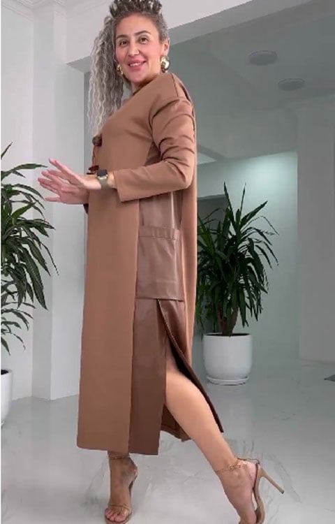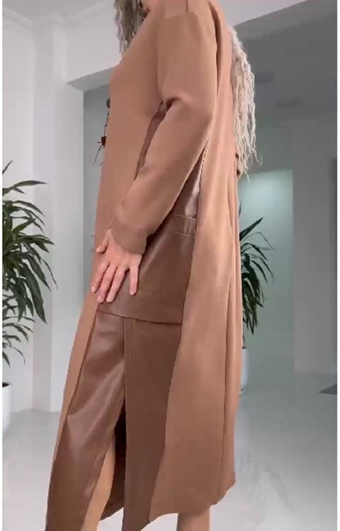 A bőr patchwork ruha laza szabással és egyedi bőr patchwork díszítéssel rendelkezik az oldalán , amelyek merész, stílusos kontrasztot adnak a puha anyaggal.