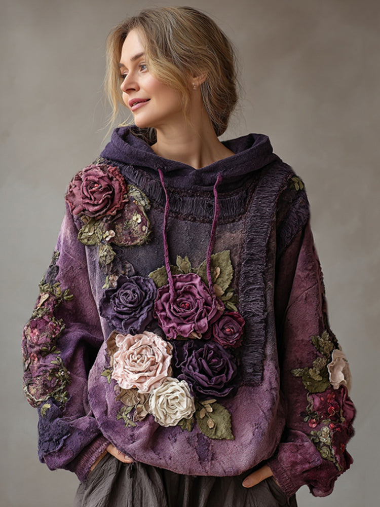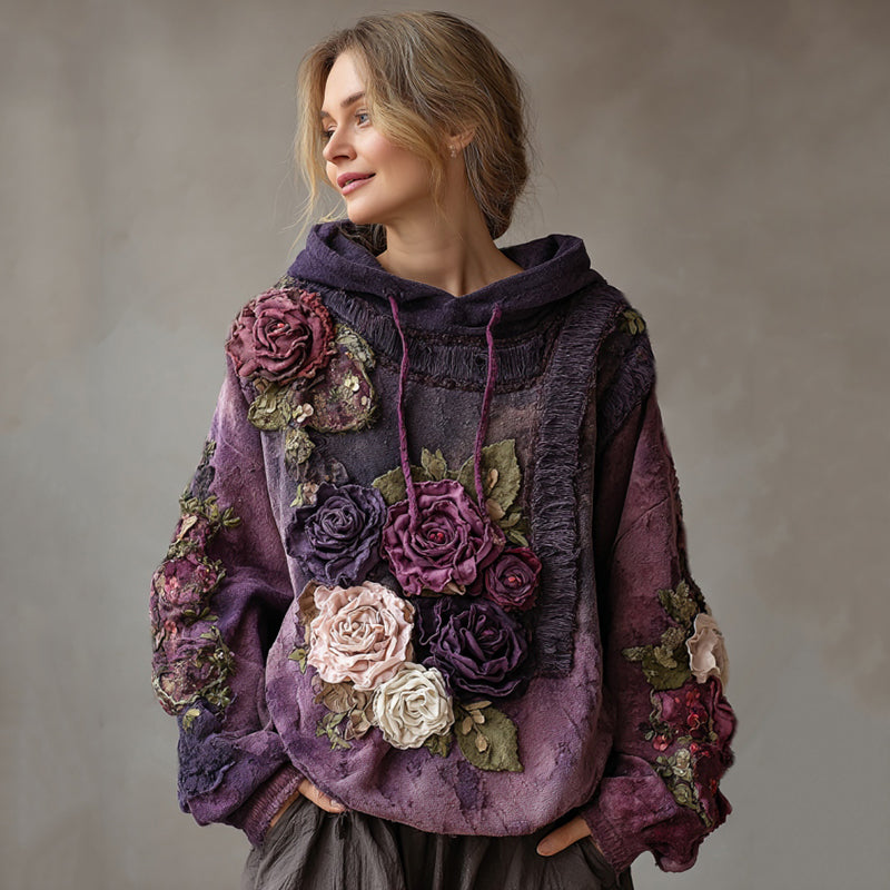 Női kényelmes kapucnis pulóver lila és rózsaszín hímzéssel