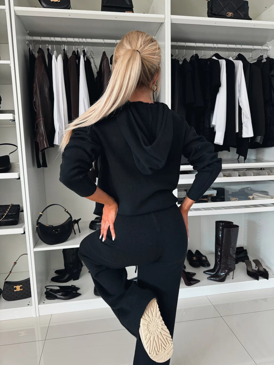 Kétrészes női szett hosszú ujjal, kapucnival és kerek nyakkal